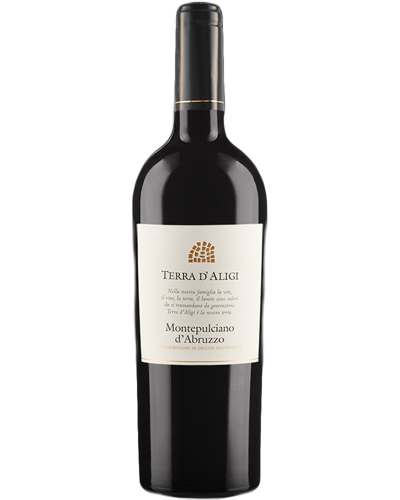 Vino rosso Montepulciano d’Abruzzo DOC di cantina Terra d’Aligi. Vino tipico della tradizione abruzzese e della produzione della cantina. Fruttato e corposo con una buona struttura. Ideale per accompagnare piatti di carne alla griglia.