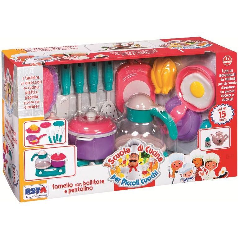 Playset scuola di cucina per piccoli cuohi.Set da 15 pezzi: tagliere, padella, piatti e gli accessri da cucina, pronta per giocare!