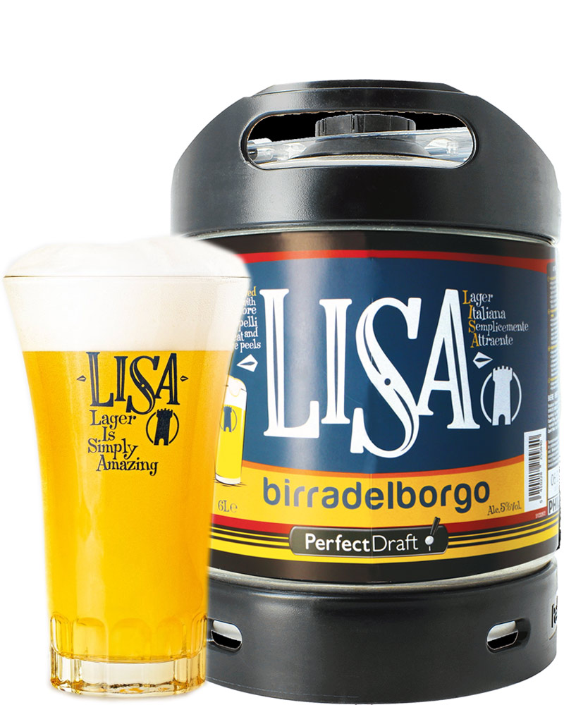 Birra lager bionda LISA dal birrificio italiano Birra del Borgo. Si utilizzano malti e grano italiani con una cura artigianale per avere una birra fresca e fragrante con un gusto maltato ed elegante. Da gustare e spillare con solo con impianto Philips Perfect Draft