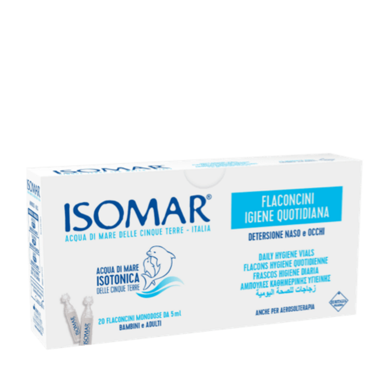 Isomar Flaconcini Igiene quotidiana è indicato per la detersione anche quotidiana di naso, orecchie e occhi. Utilizzabile anche in aerosol terapia
