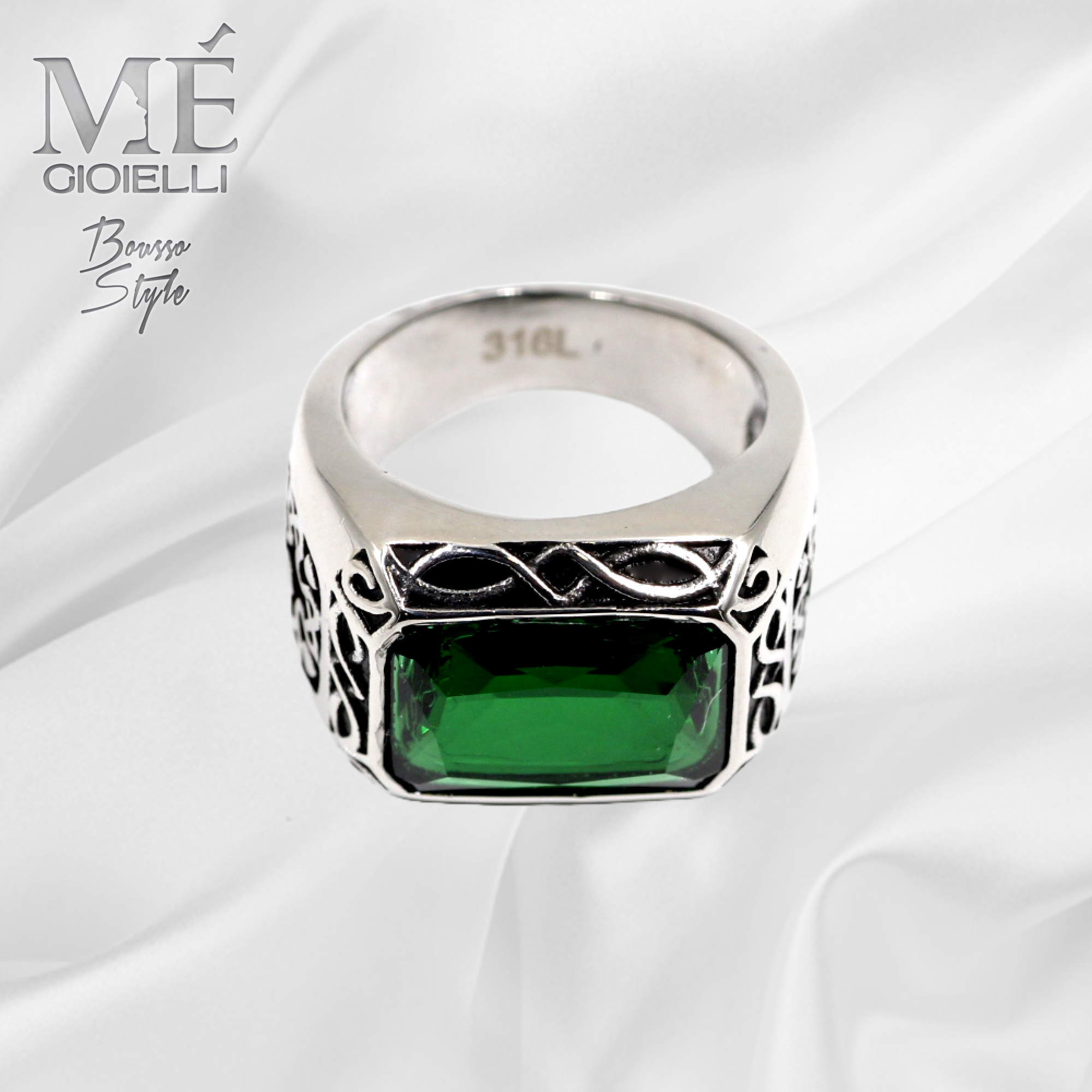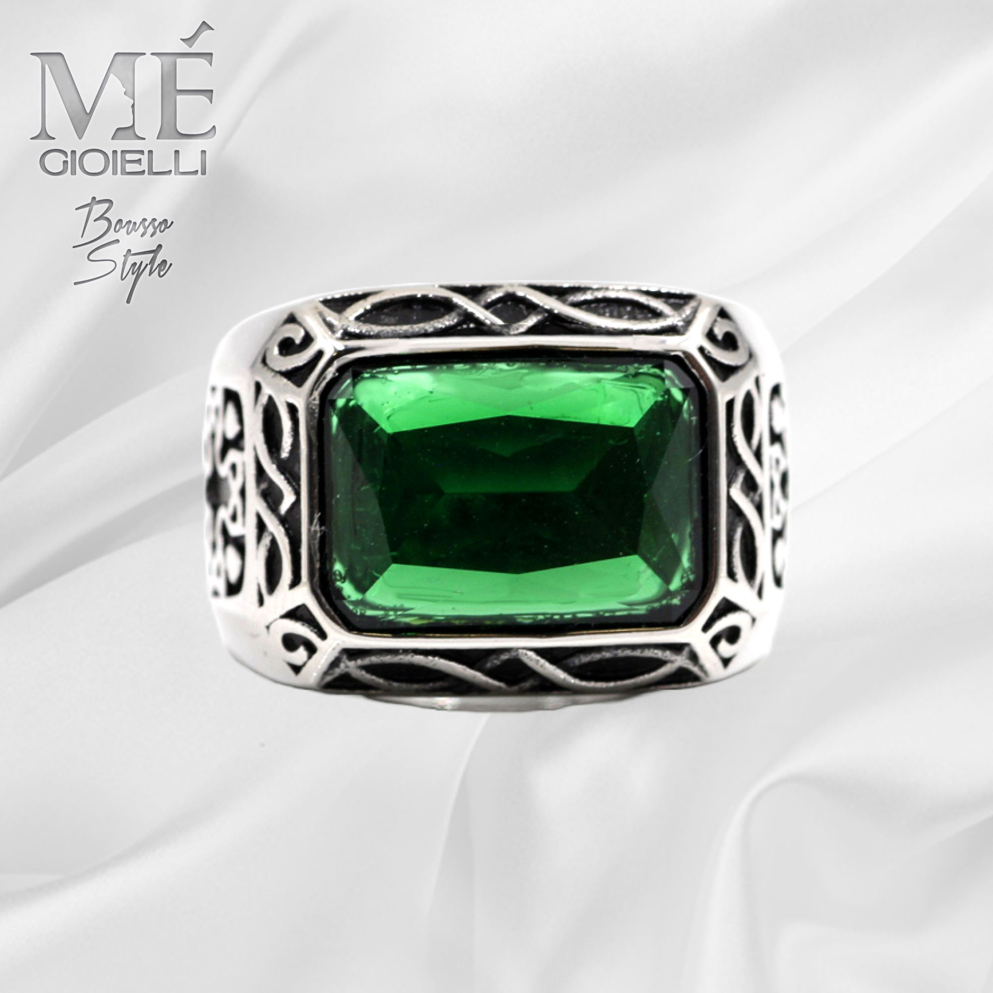 L’Anello Rettangolare Green è completamente realizzati in acciaio inossidabile anallergico con la tecnica della cera persa FREE NICHEL e bruniture.