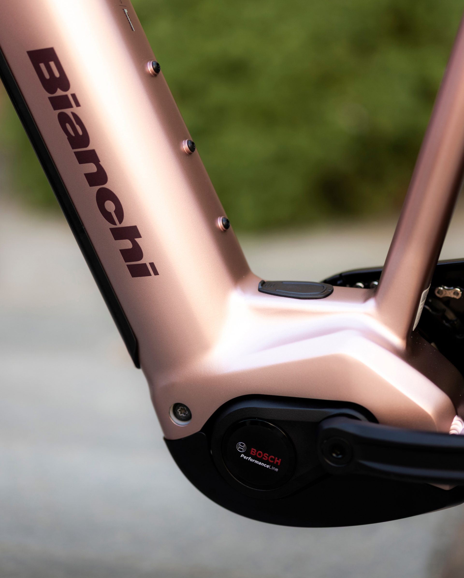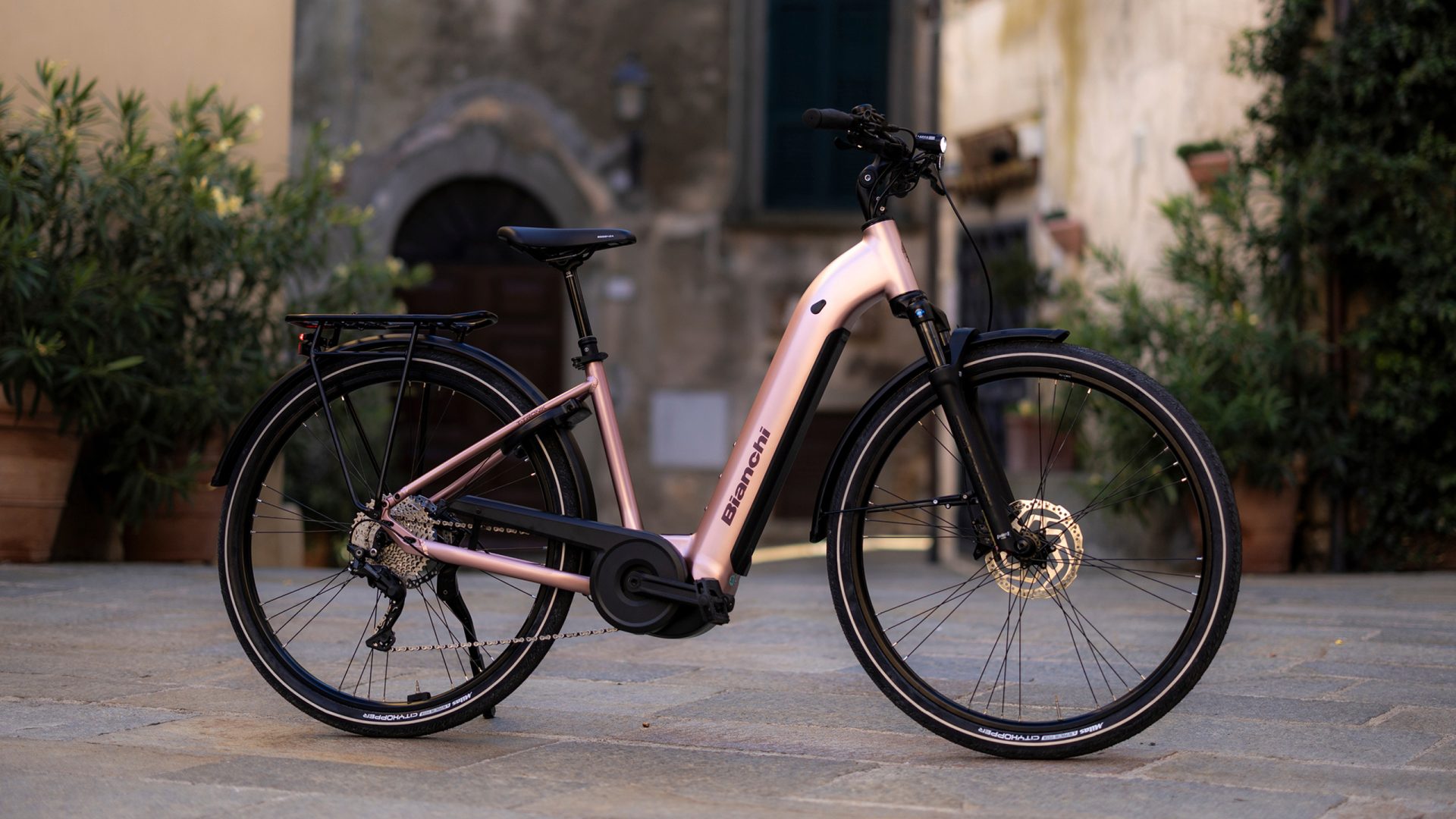 Il telaio in alluminio, rifinito nella sofisticata colorazione Rosa Metallico, presenta una geometria che favorisce una posizione di guida eretta e sicura, riducendo l’affaticamento su schiena e polsi. L’integrazione della batteria e il passaggio dei cavi interno mantengono le linee pulite, tipiche del design d’alta gamma Bianchi. È la compagna ideale per chi cerca un mezzo affidabile, potente e incredibilmente chic.