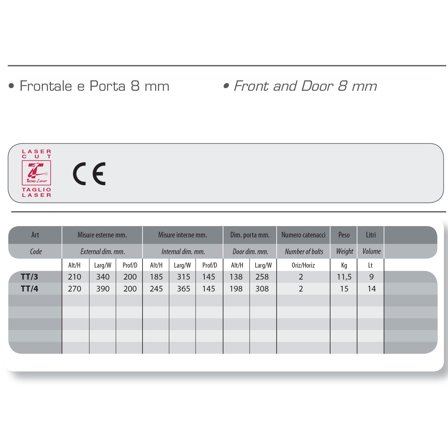 - Serratura per apertura in caso di emergenza (2 chiavi in dotazione).