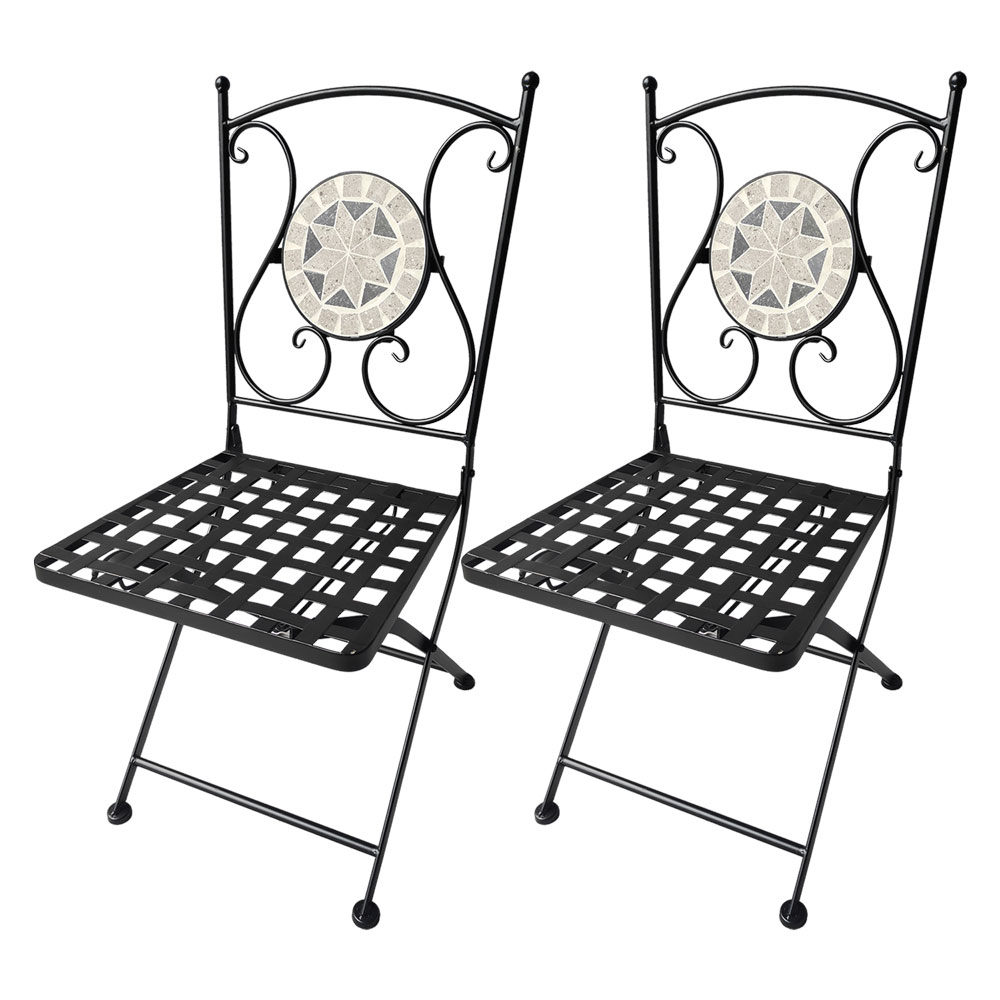 Struttura in metallo verniciato, ripieghevoli. Decorazione in mosaico simil pietra su schienale.