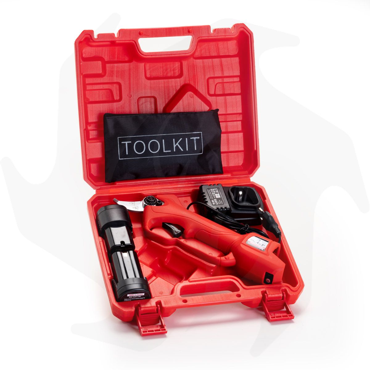 La valigetta inclusa contiene tutto il necessario per iniziare subito a lavorare: la cesoia a batteria, le due batterie al litio, il caricabatterie, un kit di regolazione, un contenitore per l’olio e le istruzioni per l’uso.