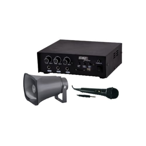 Corredato di un diffusore a tromba da 25W/8O e di microfono dinamico 600 ohm.