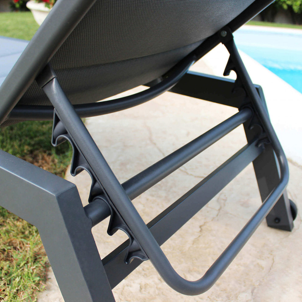 La struttura in alluminio verniciato antracite garantisce leggerezza, stabilità e resistenza agli agenti atmosferici. Il textilene imbottito offre un comfort superiore rispetto ai lettini tradizionali, assicurando una seduta morbida, traspirante e piacevole anche durante lunghe sessioni di relax.