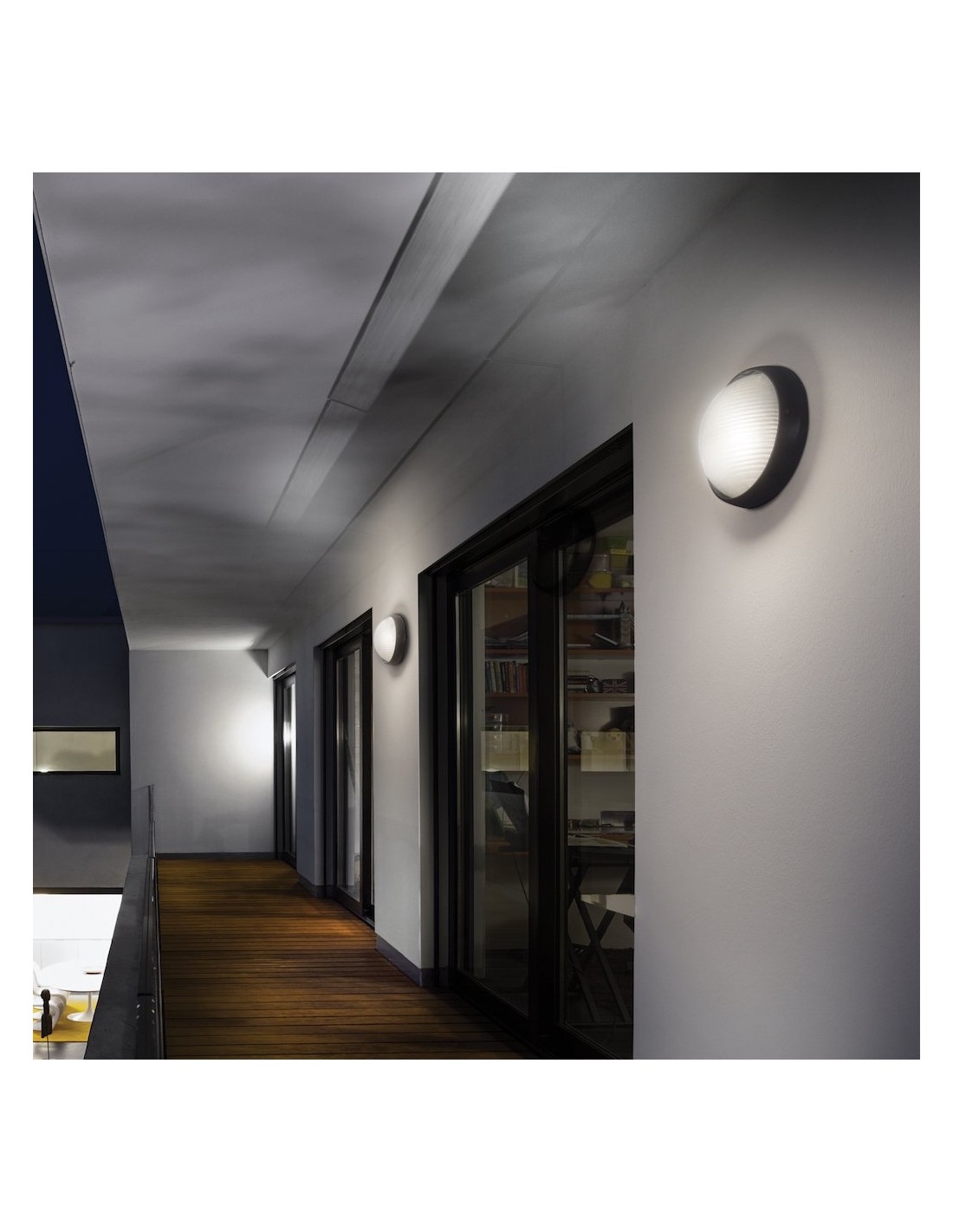 Corpo in materiale termoplastico, diffusore in vetro. Portalampade E27. Alimentazione max 60W. Grado di protezione IP44. Dimensioni mm.204x115x95h.