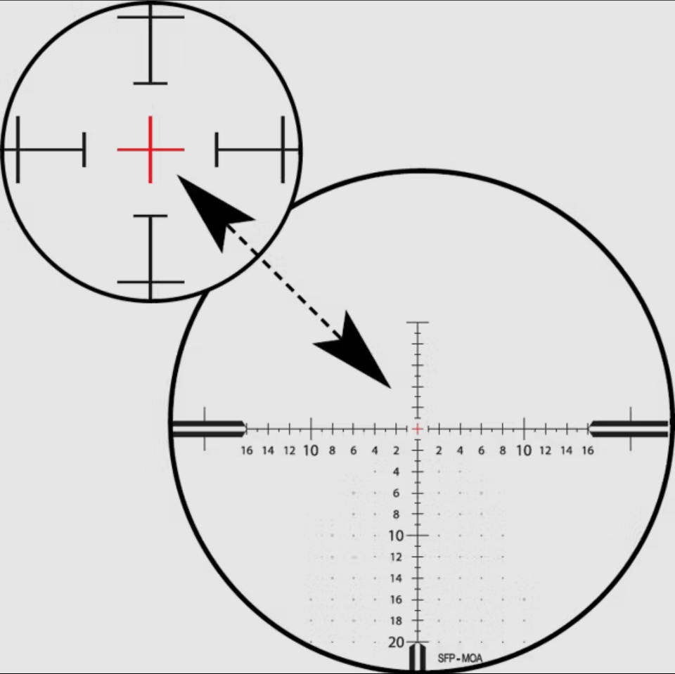 Il reticolo ZMOAi-T20 è ideale per la caccia su terreni aperti o su lunghe distanze. Il reticolo con minuto d’angolo (MOA) estremamente fine, con una copertura di soli 0,06 MOA e ingrandimento di 24x, comprende riferimenti MOA e punti, che assicurano una distanza di 1 MOA con un ingrandimento di riferimento e coprono una caduta del proiettile di 20 MOA. Le linee laterali e i punti di aggiustamento sono estremamente utili per la correzione del vento e sono posizionati nel campo visivo in modo tale da garantire la massima efficacia e la minima distrazione. Solo l’area centrale del reticolo è illuminata: un puntamento estremamente efficace e preciso in condizioni di scarsa luminosità. L’app ZEISS Hunting può essere utilizzata per determinare con rapidità e precisione il cambio di copertura e i risultanti valori di compensazione della caduta del proiettile e di correzione della deriva del vento, praticamente per qualsiasi munizione.